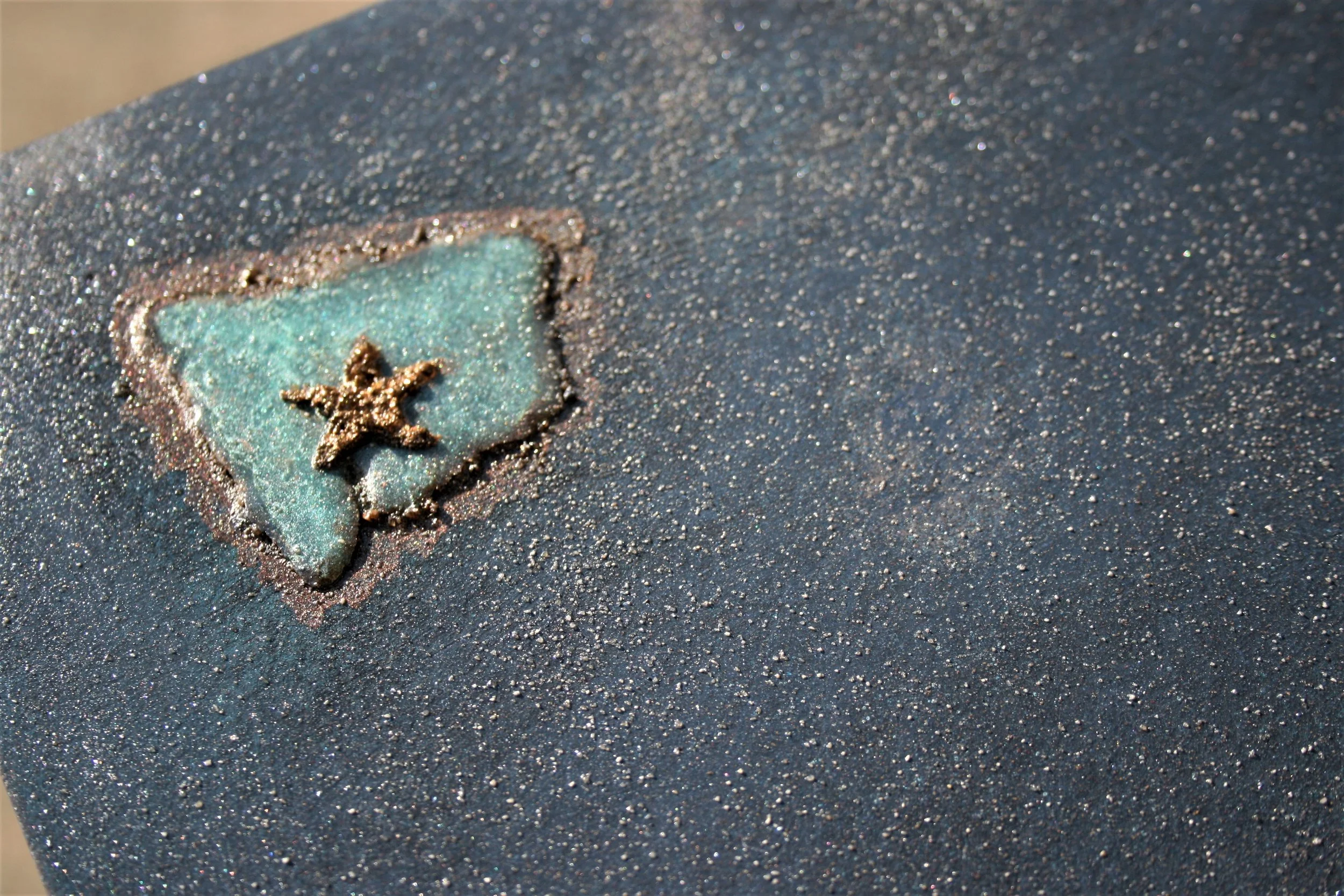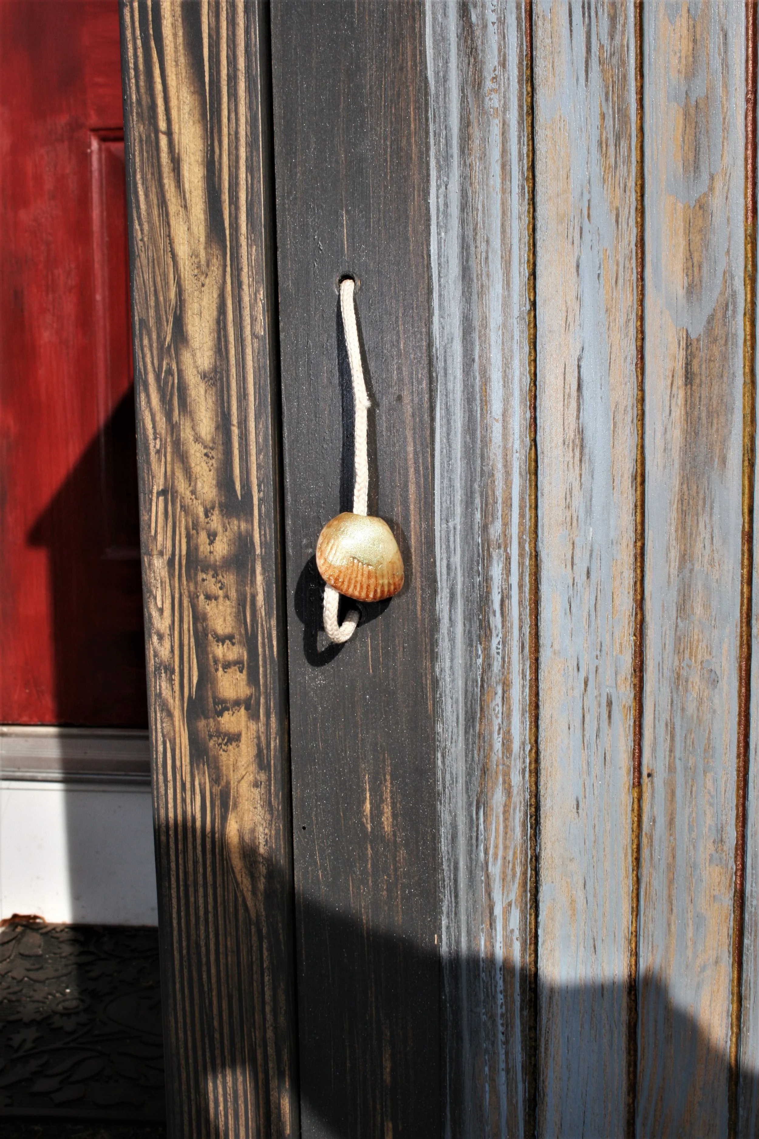 Reclaimed Maple; Finished, Grained, and Distressed with RTJ Resin Paint and Glaze; Decorated with Epoxy Appliqués and Locally Sourced Seashells